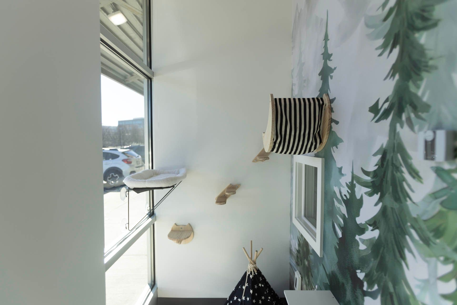 In our largest suites, your furry family member will get a taste of the great outdoors on this camping trip adventure. Bird watching and stargazing are included with this suite's exterior windows. 300+ cubic feet of coziness for your cat to enjoy!
