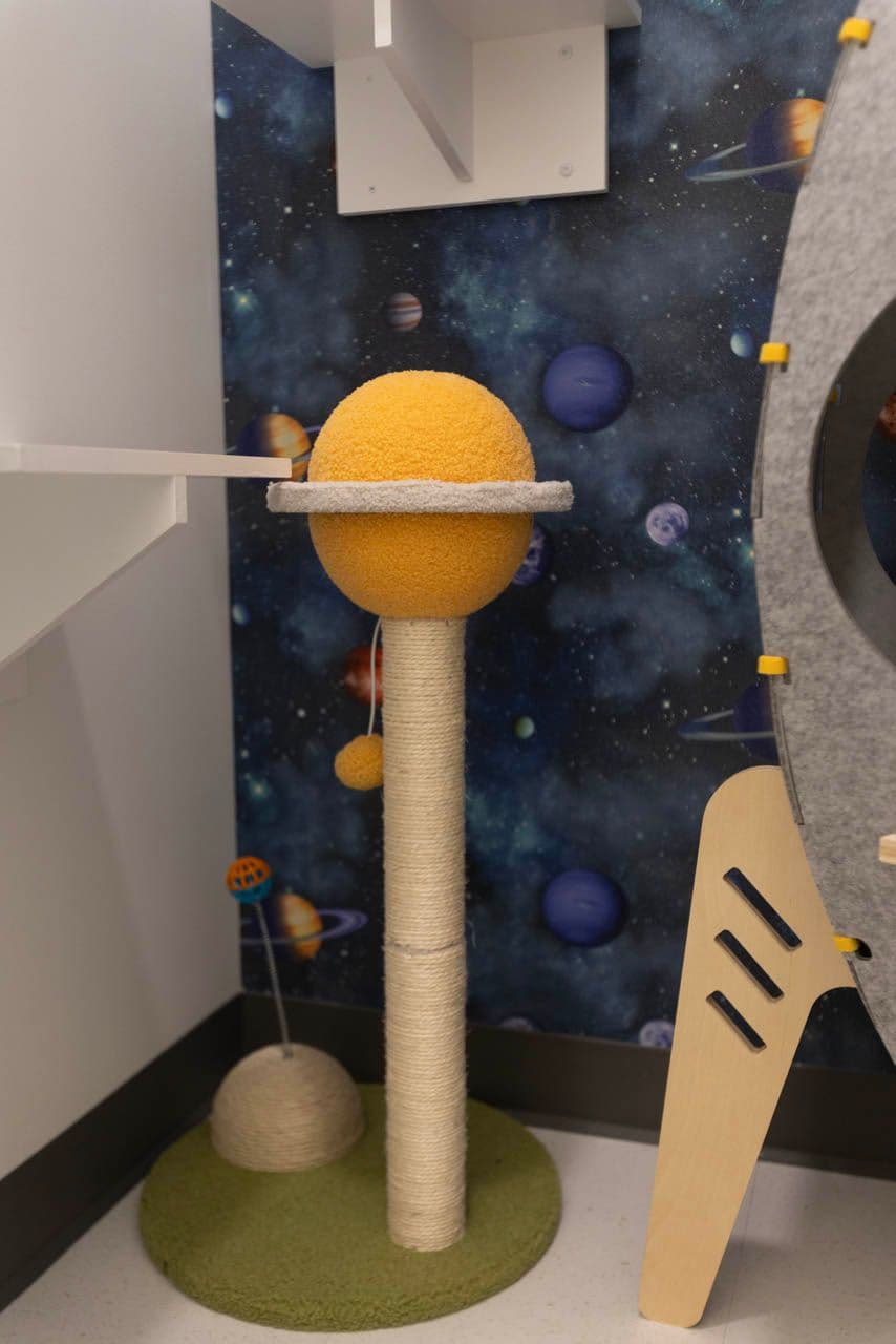5, 4, 3, 2, 1 BLAST OFF! Your kitty will feel out of this world on a trip of a lifetime in the solar system suite. 200+ cubic feet of coziness for your cat to enjoy!