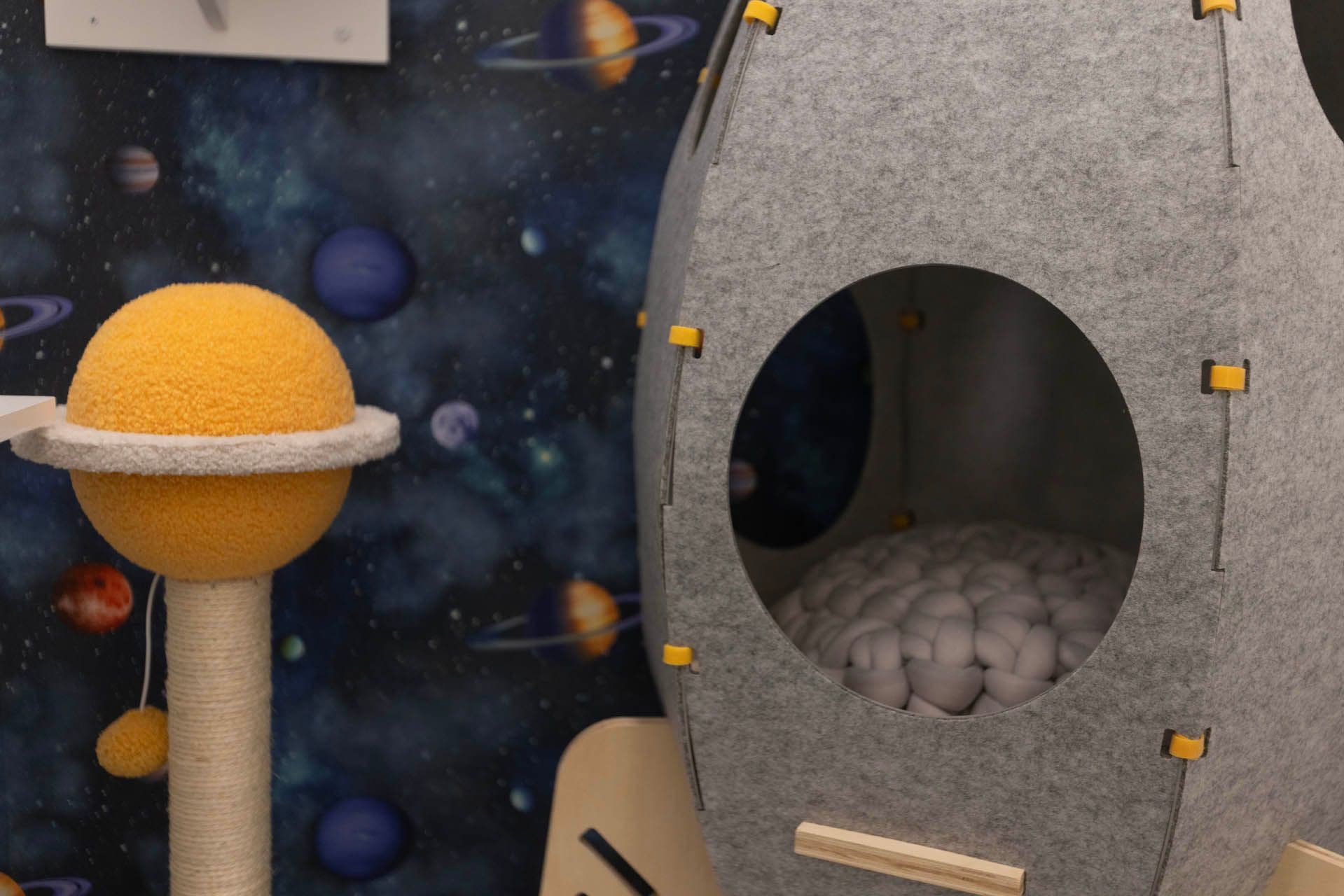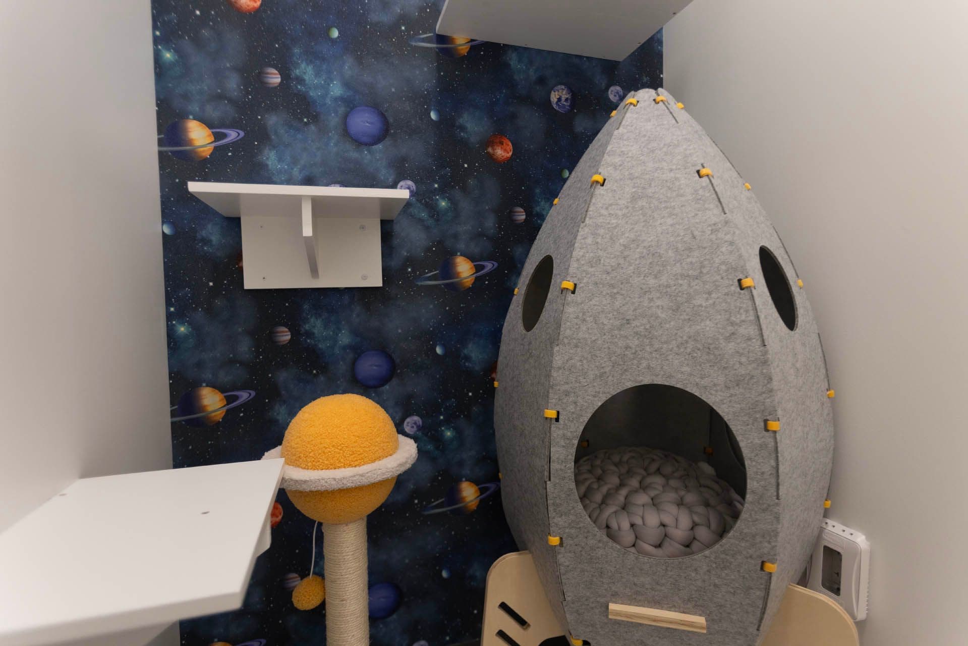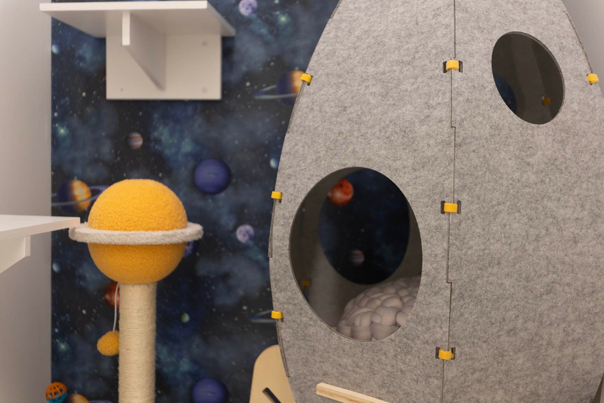 5, 4, 3, 2, 1 BLAST OFF! Your kitty will feel out of this world on a trip of a lifetime in the solar system suite. 200+ cubic feet of coziness for your cat to enjoy!